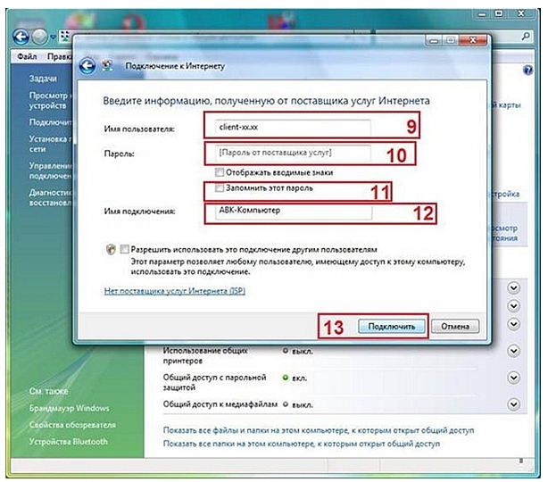 5. ВведитеИмя пользователя [9], Пароль [10] и Имя подключения [12].