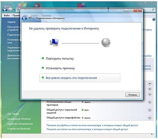 6. Если появится сообщение: «Не удалось проверить подключение к Интернету», всё равно нажмите: «Все равно создать подключение». После чего, проверьте физическое подключение. Такое сообщение может появляться только если ваш компьютер не видит PPPoE сервер. Также причиной может быть неправильно настроенный файервол.