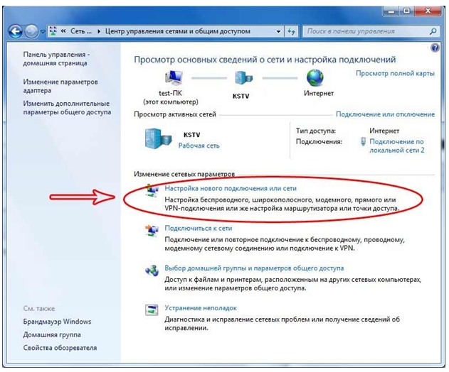 3. Нажмите Настройка нового подключения или сети