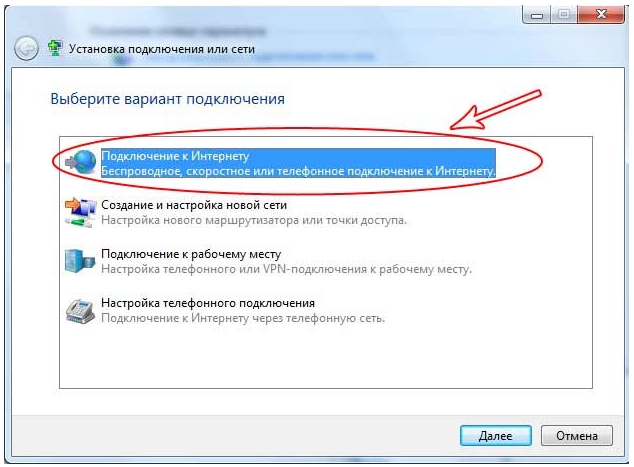4. Выберите пункт Подключение к Интернету, Беспроводное, скоростное или телефонноеи нажмите Далее.