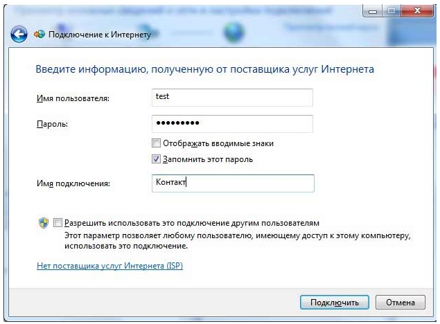 7. В поле Имя пользователявведите имя из анкеты, из строчки PPPoE. В поле Парольвведите пароль. Установите галочку Запомнить этот пароль. В поле Имя подключениявведите Контакт. При наличии на компьютере других пользователей установите галочку Разрешить использовать это подключение другим пользователям.