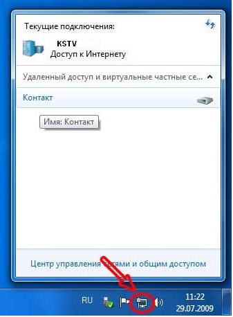 8. Вызвать подключение можно, нажав левой кнопкой на пиктограмму компьютера в правом нижнем углу. Выбрать Контакти нажать на Подключение