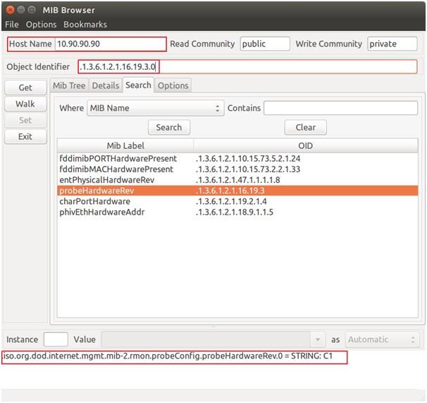snmpget -v2c -c private 10.90.90.90 .1.3.6.1.2.1.16.19.3.0