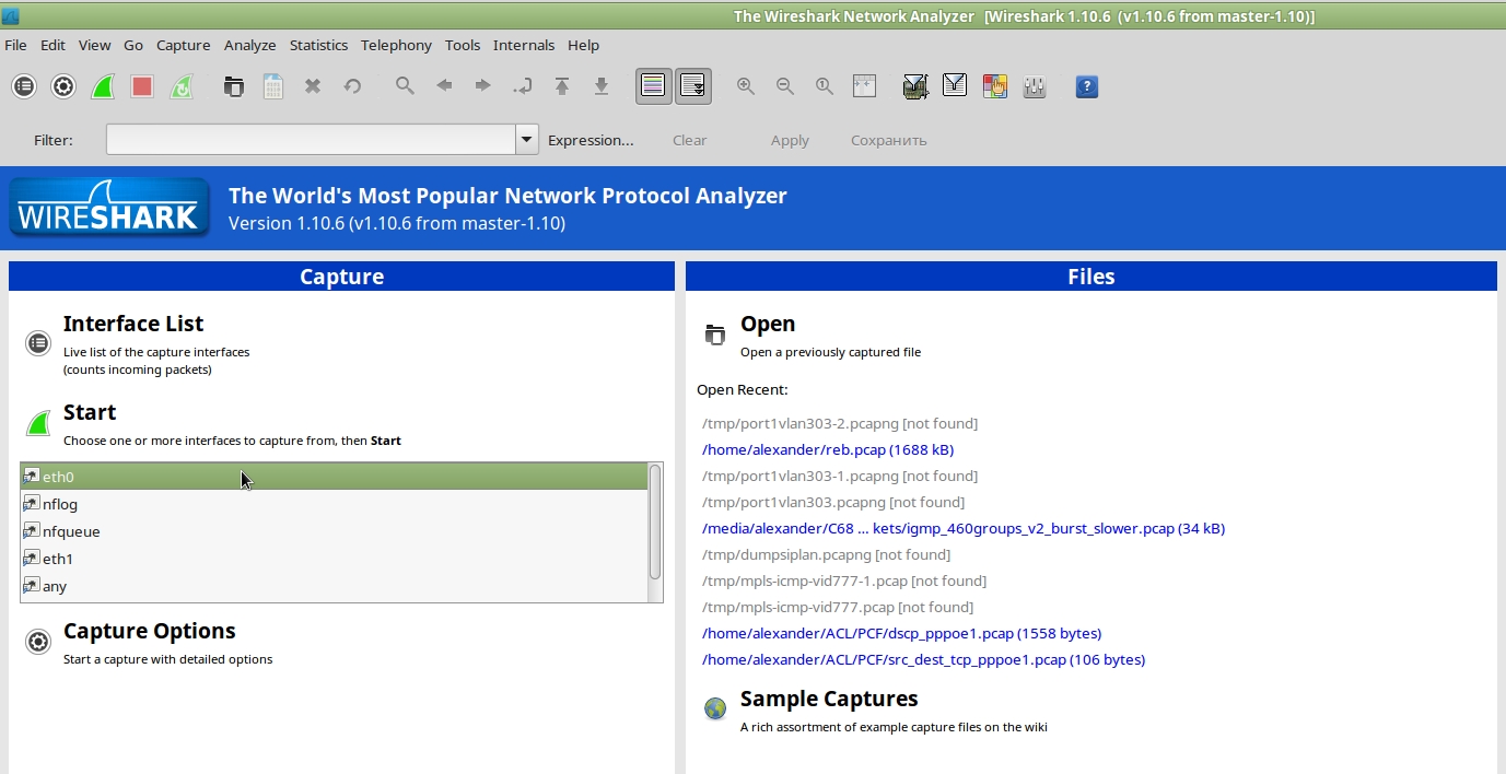 Затем на PC3 запускаем программу-анализатор трафика, например, Wireshark. Ее главное окно выглядит следующим образом (Рисунок 1):
