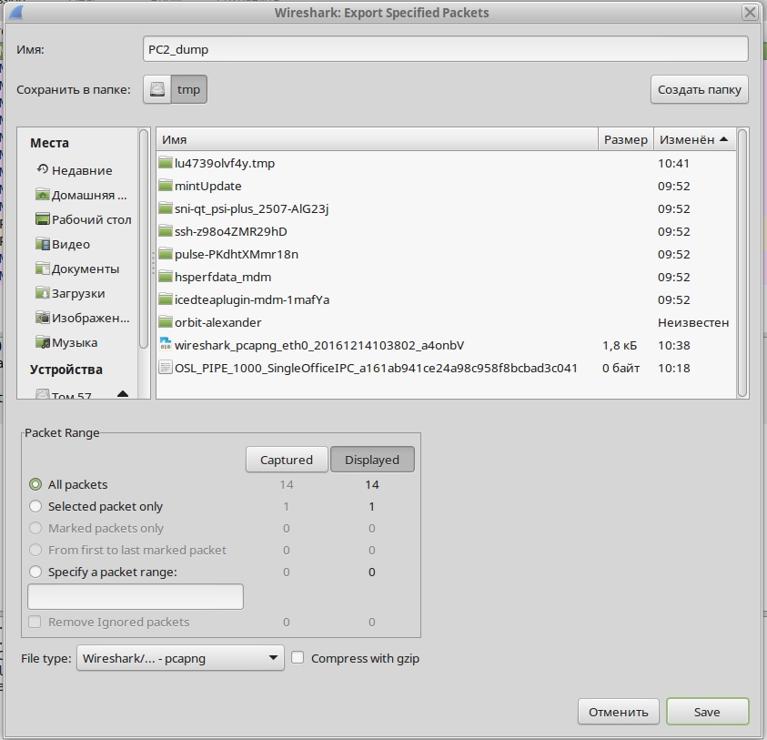 В этом окне нужно указать имя сохраняемого файла, выбрать каталог сохранения, и выбрать тип файла (File type) - обычно это pcapng или pcap. Затем нажимаем Save, и требуемый дамп трафика сохранен.