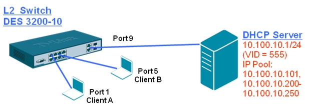 Client B: 10.100.10.200-250 (любой из диапазона)