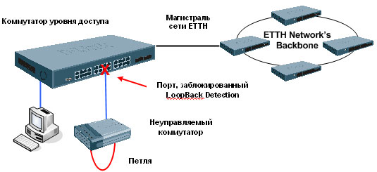 Ситуация, показанная на рисунке, вынуждает управляемый коммутатор постоянно перестраивать «дерево» STP при получении своего же собственного BPDU. Новая функция LoopBack Detection отслеживает такие ситуации и блокирует порт, на котором обнаружена петля, тем самым предотвращая проблемы в сети независимо от работы STP протокола. Т.е. неважно, включен STP протокол на порту или выключен – петля будет обнаружена, и порт будет заблокирован. Петля на порту обнаруживается путём отсылки коммутатором пакета с адресом назначения CF-00-00-00-00-00 (9000 Ethernet Configuration Test protocol (Loopback)). Это нужно учитывать при составлении правил ACL.