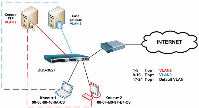 Сервер базы данных находится во VLAN 3 (9-16 порт)
