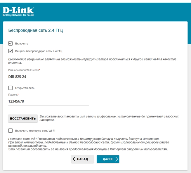 - Аналогично выполняется настройка беспроводной сети для диапазона 5 ГГц. Для перехода к следующему шагу настройки нажмите Далее.