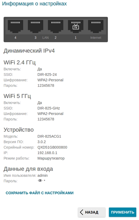 - На следующей странице должно появиться окно с информацией о выполненных настройках. Вы можете сохранить данные настройки в текстовый документ, нажав для этого кнопку Сохранить файл с настройками.