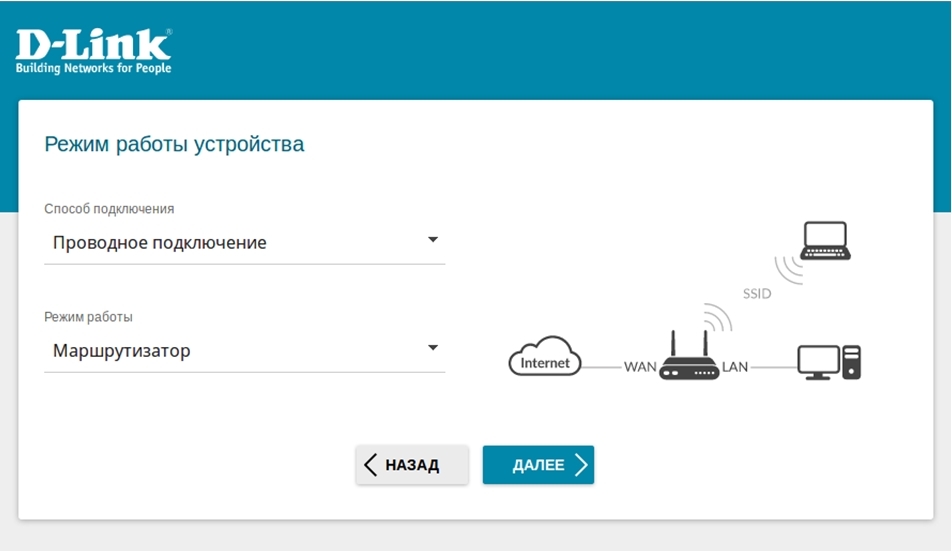 - В списке Способ подключения выберите Проводное подключение, в качестве режима работы задайте Маршрутизатор и нажмите Далее.