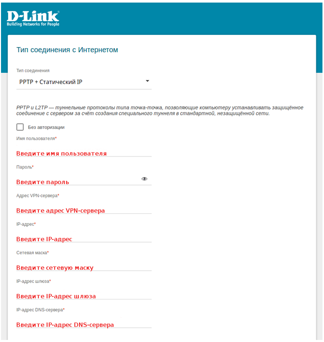 В соответствии с данными от вашего интернет-провайдера заполните поля Имя пользователя, Пароль, Адрес VPN-сервера, IP-адрес, Сетевая маска, IP-адрес шлюза, IP-адрес DNS-сервера. Если ввод пароля не требуется, установите флажок в поле Без авторизации.