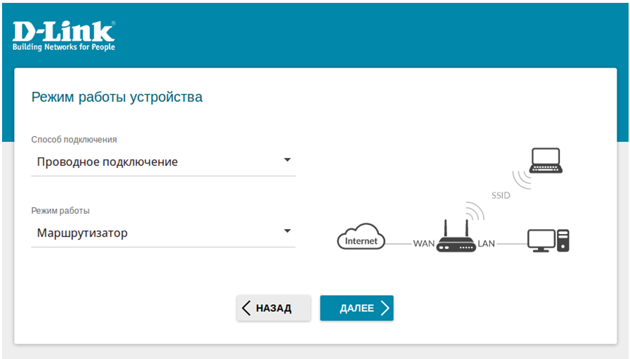 - В списке Способ подключения выберите Проводное подключение, в качестве режима работы задайте Маршрутизатор и нажмите Далее.