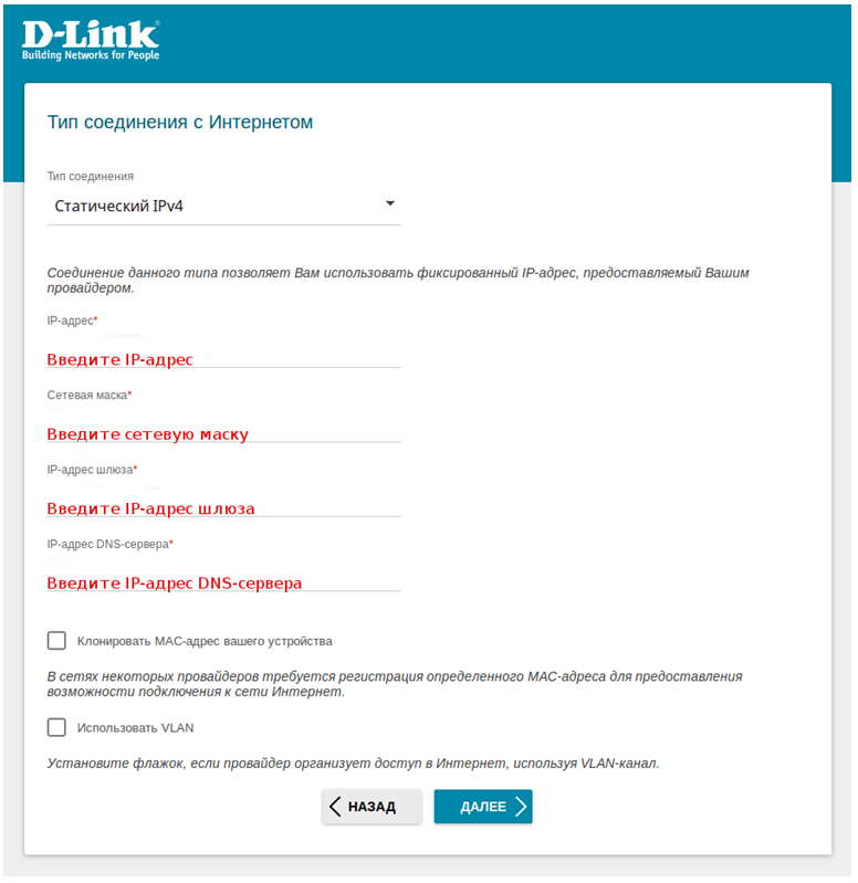 В соответствии с данными от Вашего интернет-провайдера заполните поля IP-адрес, Сетевая маска, IP-адрес шлюза, IP-адрес DNS-сервера.