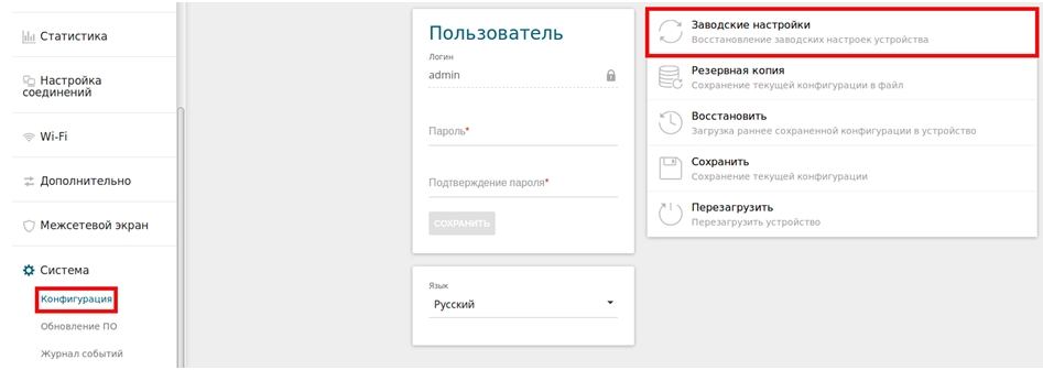 - В разделе Система выберите подраздел Конфигурация и в открывшемся меню выберите Заводские настройки. В течение нескольких минут заводские настройки будут восстановлены.