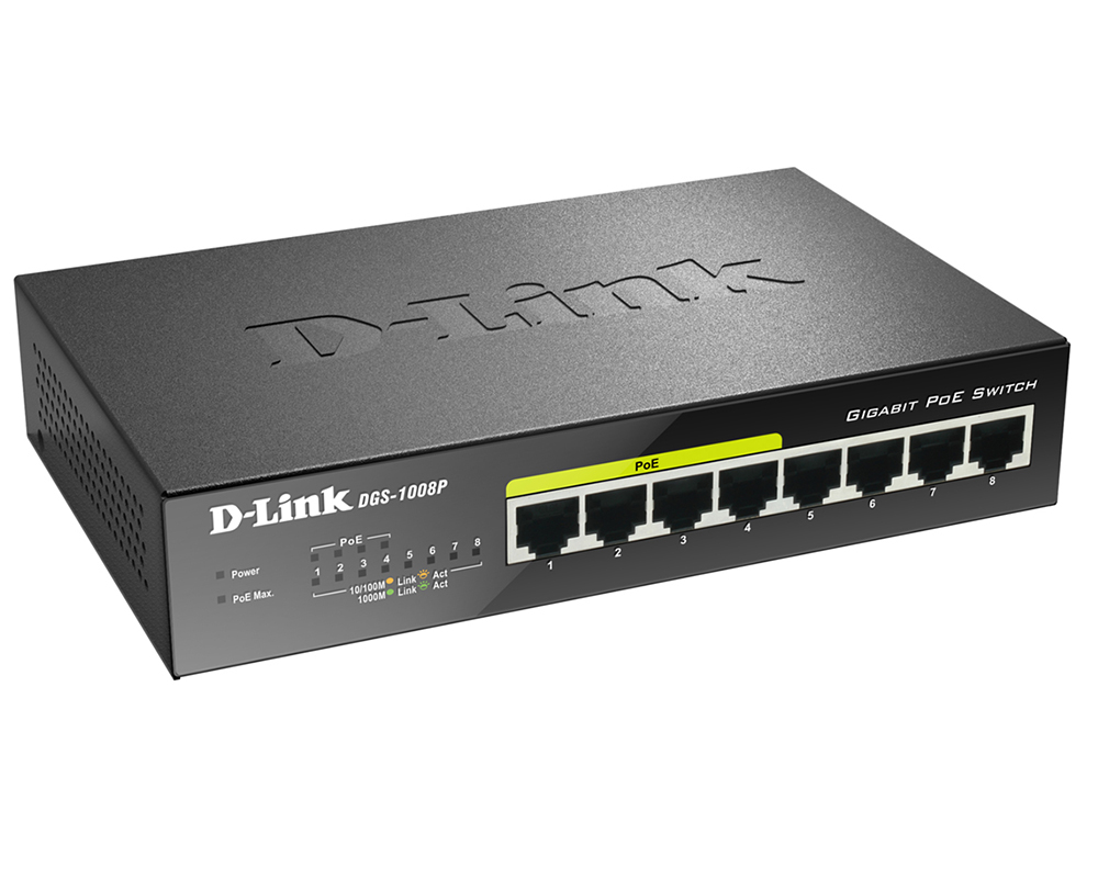 The D-Link DGS-1008P 8-port Gigabit Ethernet switch enables home and office users to easily connect and supply power to Power over Ethernet (PoE) devices such as wireless access points (APs), IP cameras, and IP phones. It also provides the opportunity to add additional Ethernet devices like computers, printers, and Network Attached Storage (NAS) onto a network. This compact PoE switch operates quietly, making it ideal for use in virtually any room or office.