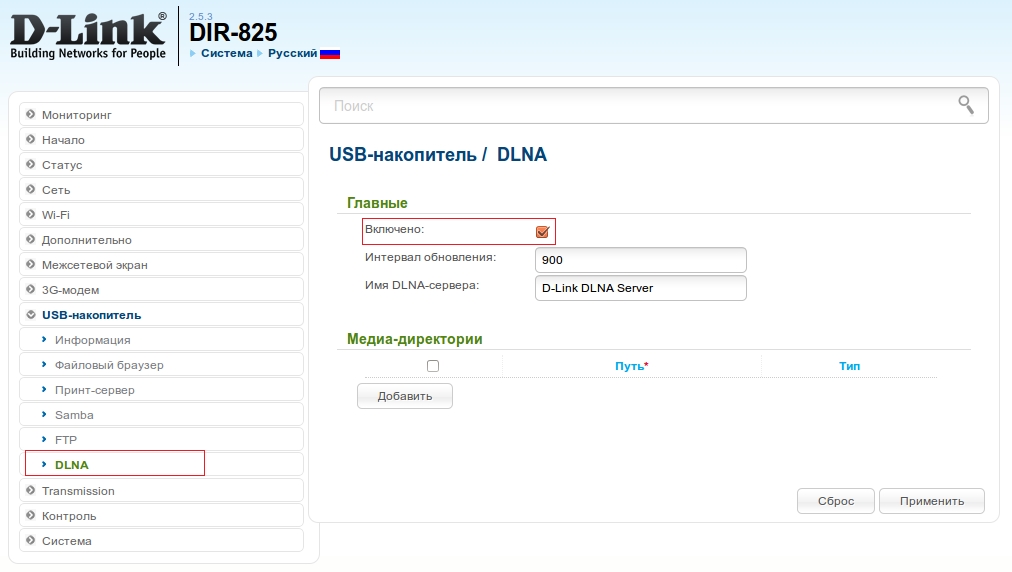 2. Далее в этом же разделе выберите пункт DLNA. На открывшейся странице установите флажок Включено.