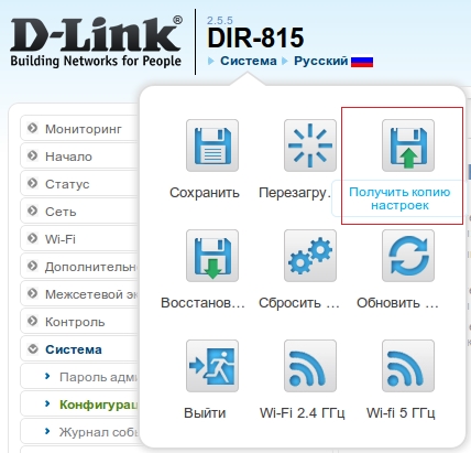 1. В левом верхнем углу страницы наведите указатель мыши на надпись Система и в открывшемся меню выберите Получить копию настроек.