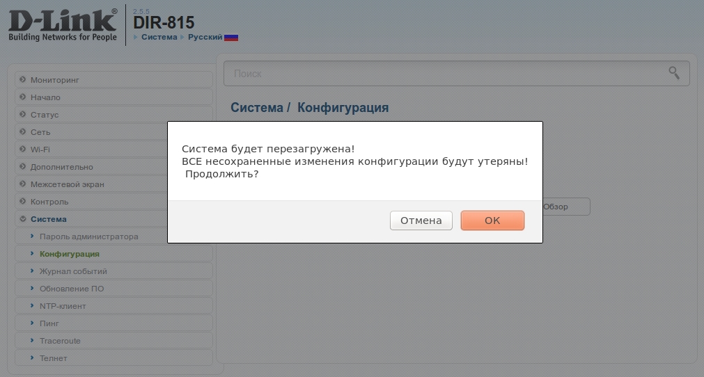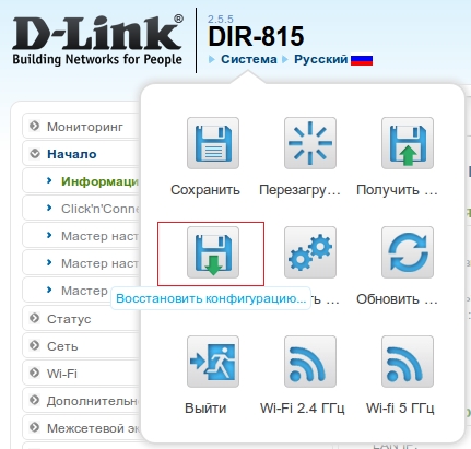 1. В левом верхнем углу страницы наведите указатель мыши на надпись Система и в открывшемся меню выберите Восстановить конфигурацию.