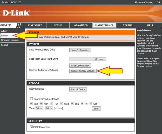 Шаг 6: После обновления прошивки камеру рекомендуется сбросить к заводским настройкам. Для этого в меню слева выберите System (Система) и нажмите кнопку Restore Factory Defaults (Восстановить заводские настройки).