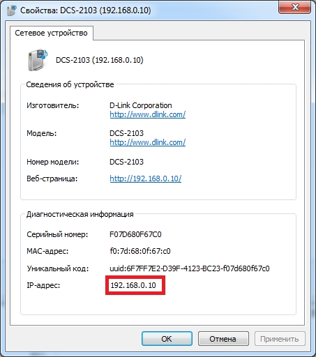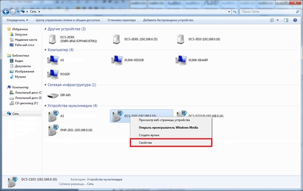 Шаг 3: В разделе Устройства мультимедиа найдите DCS-2103. В названии должен быть отображен IP-адрес камеры. Если адрес не отображается, щелкните правой кнопкой мыши по значку камеры и в открывшемся меню выберите Свойства.
