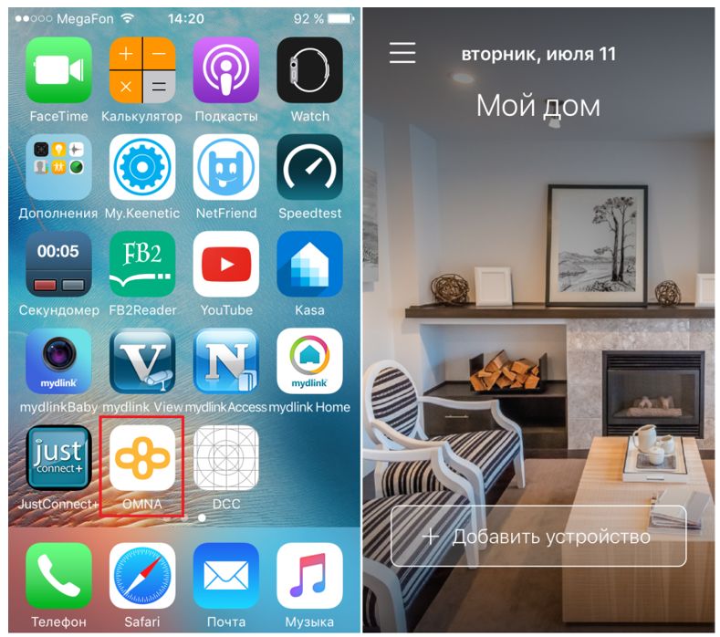 - Запустите приложение Omna и на главной странице нажмите кнопку «Добавить устройство».