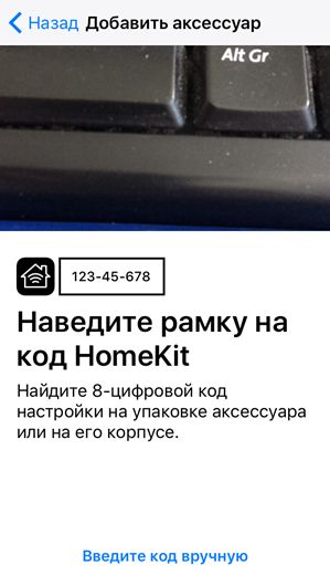 - Наведите камеру на код HomeKit на корпусе устройства для автоматического считывания или введите код вручную.
