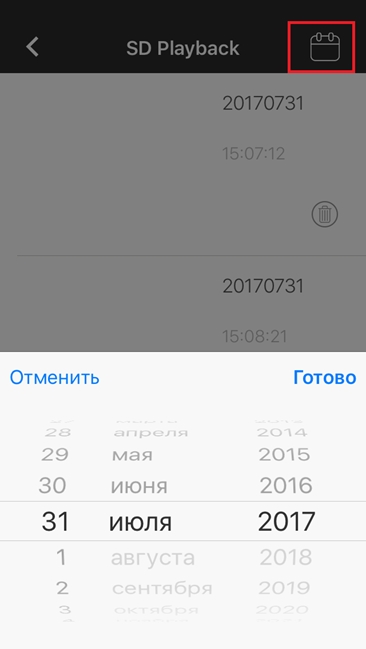 - В правом верхнем углу нажмите значок календаря и выберите дату, за которую необходимо просмотреть видеозаписи.
