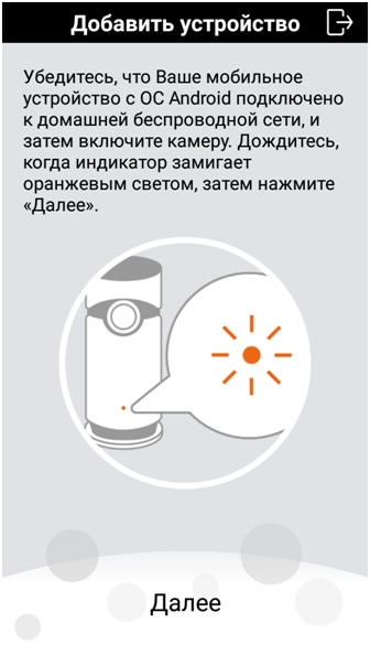 - Убедитесь, что мобильное устройство подключено к домашней беспроводной сети и индикатор на камере мигает оранжевым светом. Нажмите Далее.