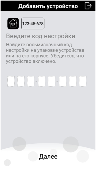 - Введите код настройки, указанный в стикере на коробке или корпусе устройства и нажмите Далее.