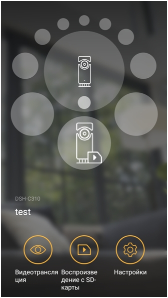 - Чтобы перейти к видеотрансляции с камеры, просмотру записей с SD-карты и настройкам, просто нажмите на значок устройства и выберите то, что нужно.