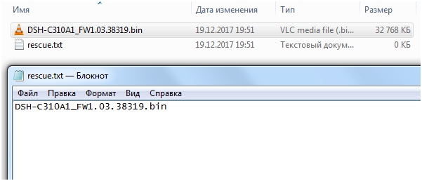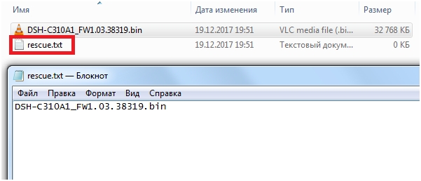 3. Создайте на microSD-карте текстовый файл с именем rescue.txt. Откройте его и пропишите название файла с ПО, который был скопирован на microSD-карту в шаге 2.
