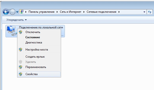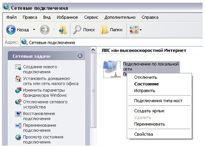 2. В окне Сетевые подключения щелкните правой кнопкой мыши по соответствующему Подключению по локальной сети и выберите строку Свойства в появившемся контекстном меню.