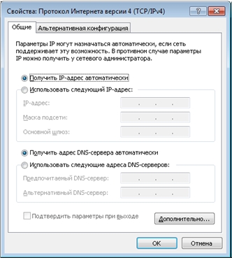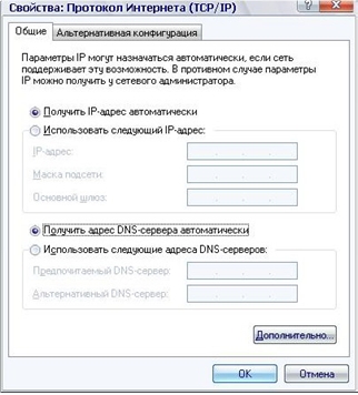 6.Установите переключатели в положение Получить IP-адрес автоматически и Получить адрес DNS-сервера автоматически. Нажмите кнопку ОК.