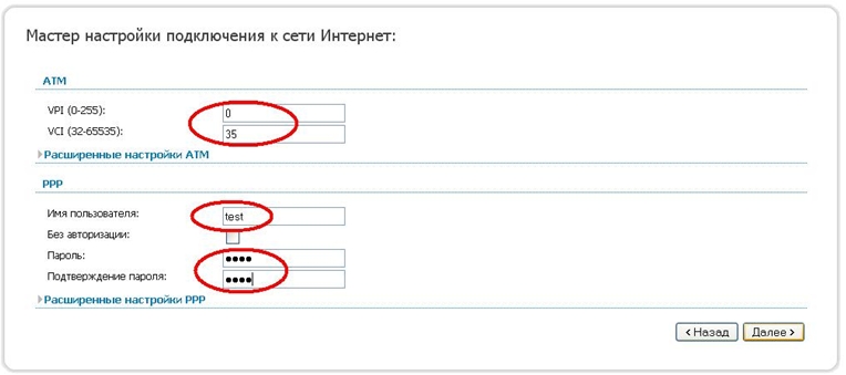 5.    На данном этапе необходимо ввести параметры VPI/VCI, Имя пользователя и пароль для подключения к интернету.  Значения параметров VPI/VCI, имя пользователя/пароль  уточните у Вашего провайдера.