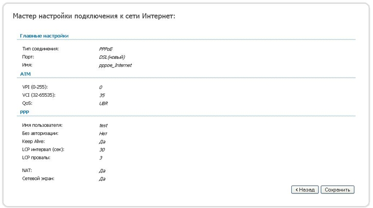 8.    На данном шаге обратите внимание на индикатор подключения. Зелёный индикатор отражает успешную настройку. Если индикатор красный- проведите настройку заново, убедившись в правильности вводимых учётных данных( VPI/VCI, имя пользователя/пароль).