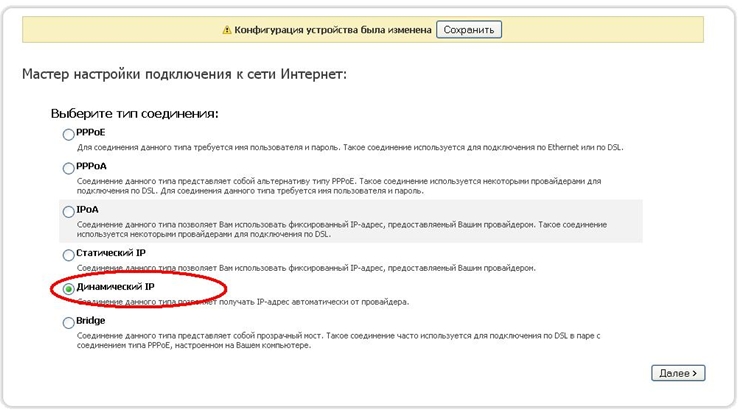 Выполните настройку аналогично первому разделу. На третьем шаге настройки выберите тип соединения «Динамический IP»