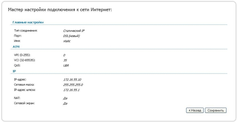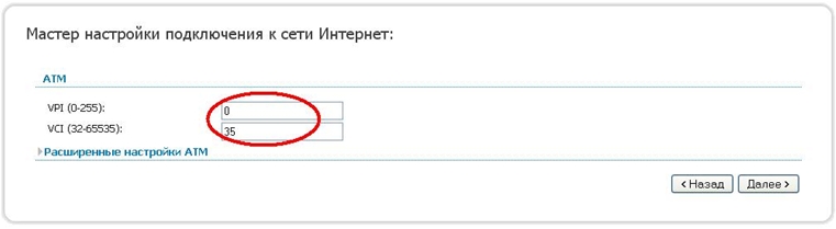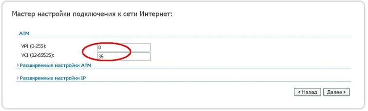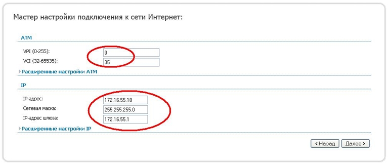 Далее вводим параметры ATM: VPI/VCIи IP: IP-адрес, сетевая маска, IP-адрес шлюза.