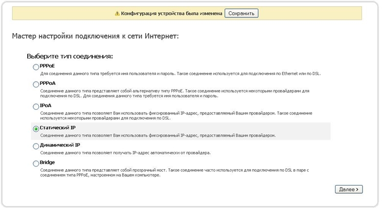 Выполните настройку аналогично первому разделу. На третьем шаге настройки выберите тип соединения «Статический IP»