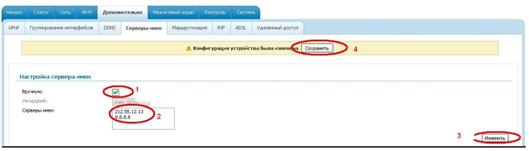 На следующем шаге перейдите в раздел «Дополнительно-Серверы имён». Выберите раздел «Вручную» и введите адреса DNS(данные адреса уточните у провайдера).