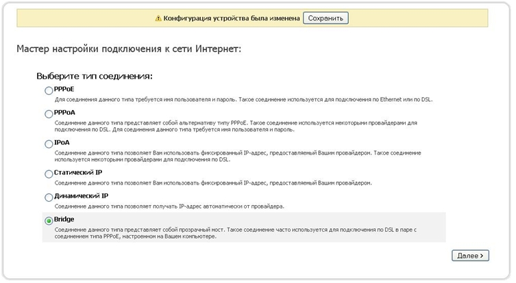 Выполните настройку аналогично первому разделу. На третьем шаге настройки выберите тип соединения «Bridge»