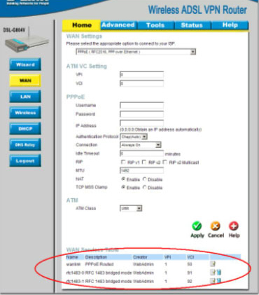 2. Нажмите на кнопку WAN в столбце под изображением DSL-G804V. В самом низу нажмите на иконку напротив интерфейса wanlink в таблице WAN Services Table. В появившемся окне (см. рис. 3) выставите следующие значения: