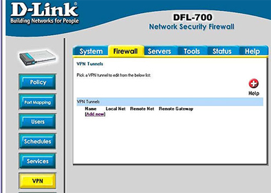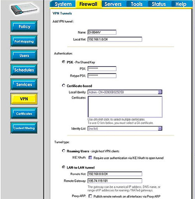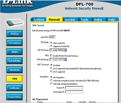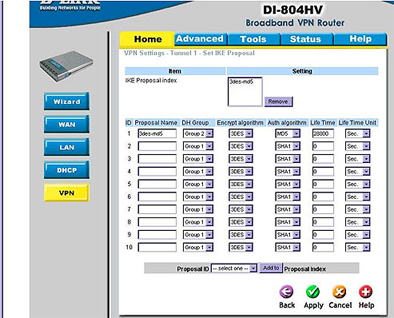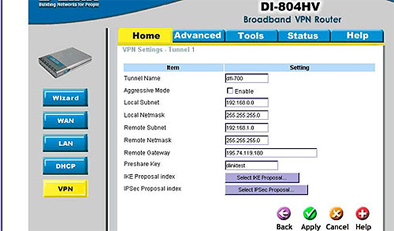 2) Зайдите на вкладку Home -> VPN. В настройках VPN, включите VPN. Задайте максимальное количество туннелей, например 5. В поле ID 1, введите имя туннеля, 'dfl-700'. Нажмите 'Apply', затем 'Continue'. В поле ID 1, установите метод 'IKE' и, затем, нажмите 'More'.