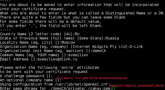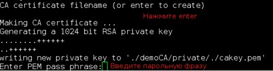 Как и при создании сертификата СА, введите парольную фразу и ответе на вопросы.