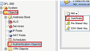 Зайдите в Objects → Authentication Objects, нажмите кнопку Add, из выпадающего меню выберите Certificate.