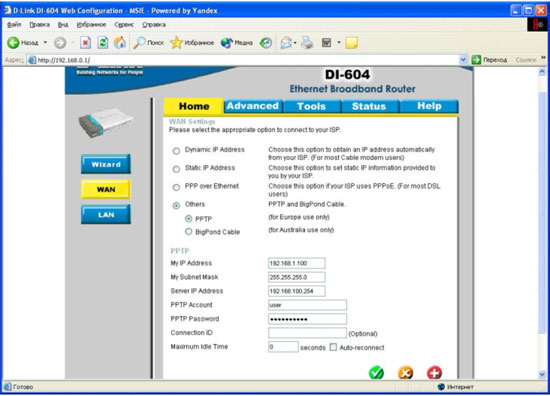 Проблема заключается в том, что при подобной организации сети некоторых провайдеров на интернет-шлюзах серии DI-XXX, в частности, DI-604, не получается организовать тоннель PPTP между DI-604 и PPTP-сервером провайдера. Причина в том, что в настройках соединения PPTP на интерент-шлюзах DI-XXX нет возможности ввести IP-адрес шлюза по умолчанию для обеспечения прохождения пакетов от DI-604 к серверу провайдера для установки PPTP-соединения. Задача решается следующим образом: в настройках DI-604 (а также любого интернет-шлюза данной серии) на закладке Advanced в пукте Routing прописывается маршрут к PPTP-серверу провайдера через маршрутизатор. В данном случае пакеты достигают назначения, т.е. PPTP-сервер и соединение PPTP устанавливается. Вот как выглядят настройки: