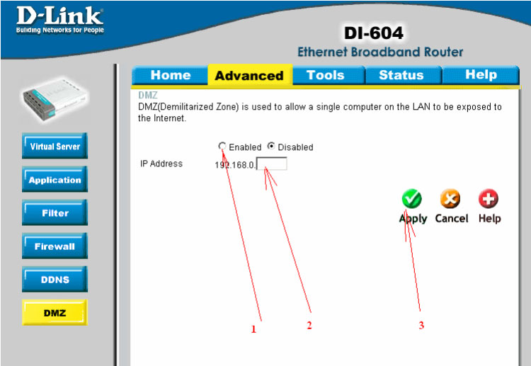DMZ - (Demilitarized Zone) - это дополнительная возможность Интернет- маршрутизаторов серии DI-XXX, предназначенная для предоставления доступа к внутренним (то есть находящимися за маршрутизатором и защищенных NAT-ом) серверам (таким, как почтовый, WWW, FTP) пользователям из Интернет. Но, в отличие от "Virtual Servers", когда отображается только один порт, в данном случае запрос извне на любой порт внешнего (WAN) интерфейса отображается на такой же порт компьютера, указанного в настройках DMZ.