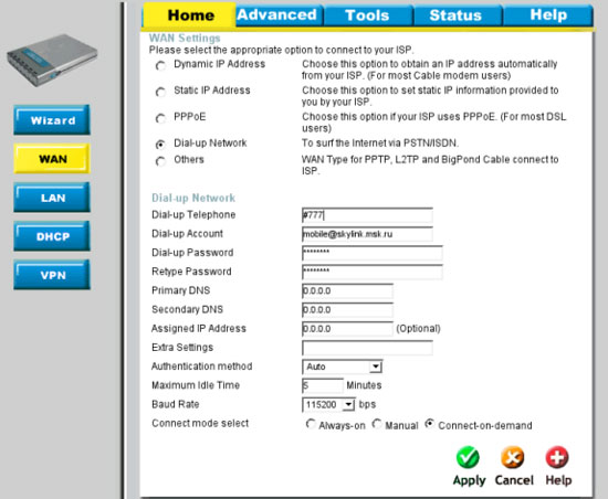 Home->WAN: Выбираем тип соединения Dial-up network, заполняем поля: