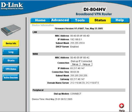 На странице Status->Device Info нажимаем на кнопку Dial-Up для проверки соединения.