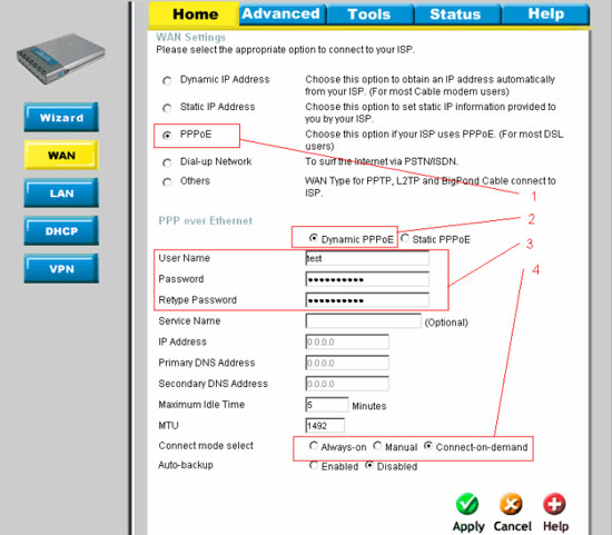 - a) Connect mode select - режим установки соединения. На рисунке выбрано "Connect-on-Demand" - установка соединения при необходимости - то есть при появлении трафика, направленного в Интернет, устройство установит соединение, а при отсутствии активности более времени, указанного в "Maximum Idle Time" - отсоединиться. Также можно поставить режим "Always-on" для постоянного подключения.В случае выбора "Manual" - соединение устанавливается и завершается вручную (см. п. 7а)